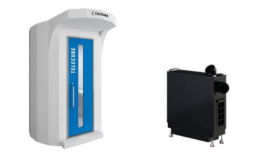<左:テレキャビン本体、右:テレキャビン内に設置される専用エアコン「CUBEreeze V4」>