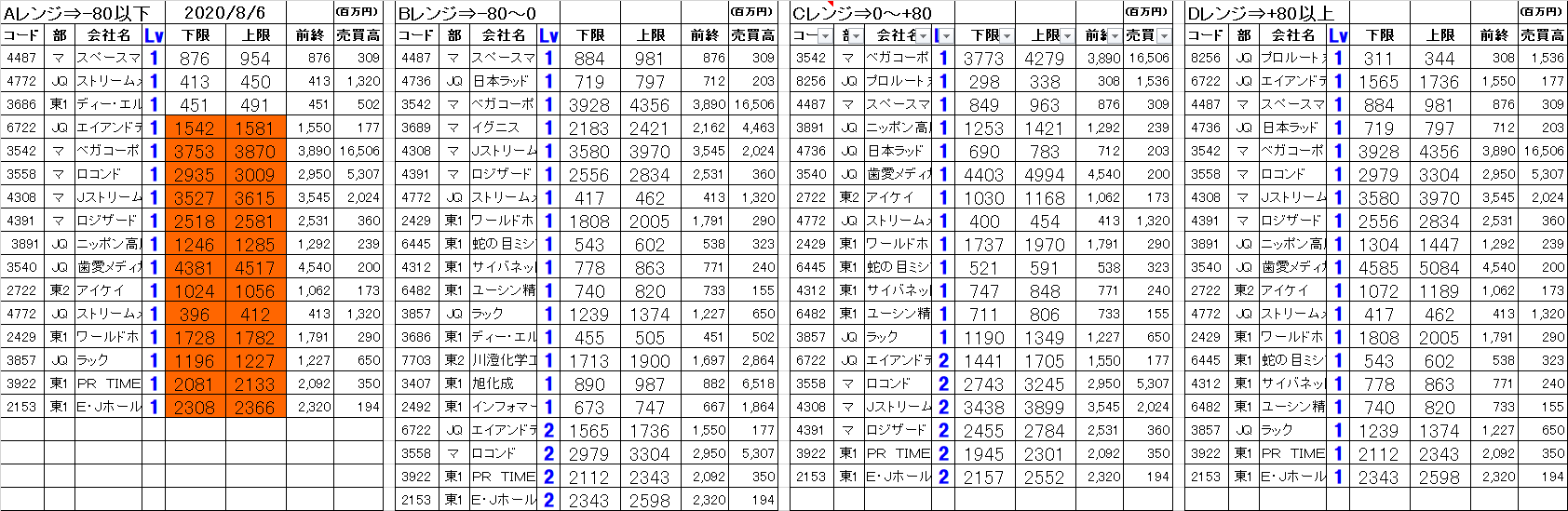 2020/8/6(木曜日) 今日のシステムトレードの仕掛候補一覧です。今日の日経の寄り付きはBレンジでした 仕掛表の各レンジは日経平均の前日終値比で以下のよ... ...続きを読む