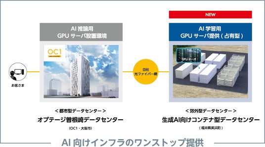 生成AIは急速に進化し、創薬や材料科学、自動運転など、様々な業界に変革をもたらす可能性を秘めていますが、その学習や運用には多大な計算リソースとコストがかかります。オプテージのAI 向けデータセンター(AI DC) は、この課題を解決する革新的なサービスです。最新のGPUサーバーに対応した液冷・コンテナ型データセンターを郊外エリアに設置することで、高負荷なAI学習も低コストで安定して処理可能です。都市部に設置されたコネクティビティ・データセンター「オプテージ曽根崎データセンター (OC1)」と、オプテージの自社光ファイバー網による通信ネットワークで接続することにより、生成AIモデルの開発・運用をワールドワイドにサポートします。