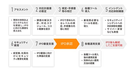 このたび、これまで積み重ねてきた支援実績をもとに、企業がIPOを目指すために必要なセキュリティ対策から、上場後の安定的なセキュリティ運用を実現するために必要な体制構築までをカバーし、最適なセキュリティ投資とリソース配分をサポートする「IPO企業セキュリティ支援サービス」を提供することといたしました。