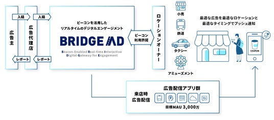 BRIDGE ADは、ビーコンが設置されている場所(ロケーション)群と、広告を配信する広告配信アプリ群をつなぐプラットフォームです。広告主は、このプラットフォームを活用することで、ターゲットとなる消費者や地域、場所の最適な組み合わせに対して、最適なタイミングで広告を配信することが可能となります。