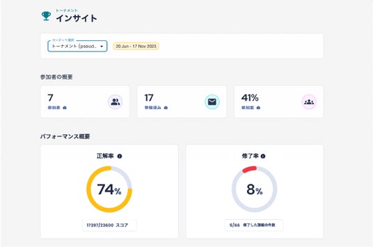スコアや実施データをもとに、脆弱性の種類や言語ごとの正解率、チーム全体や受講者別といっ