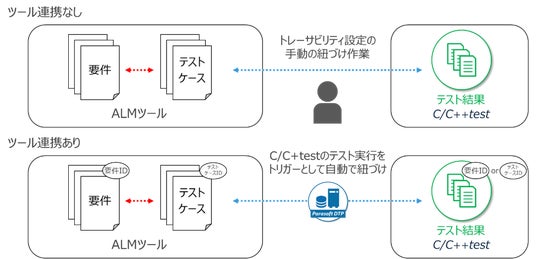 周辺ツールとの連携機能の強化として、ALMツールとの連携機能がサポートされました。この連携により、対象のALMツールで作成された要件・テストケースとC/C++testの単体テスト結果を自動で紐づけることが可能となりました。機能安全規格などで求められるトレーサビリティを効率的に確保することで、品質の向上と工数削減が期待できます。
