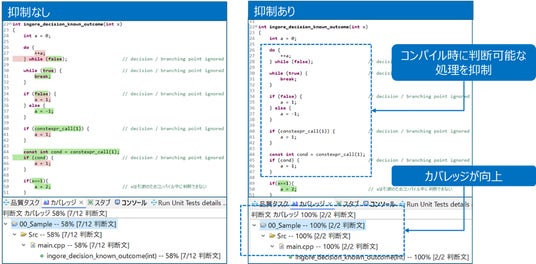 コンパイル時に判断可能な情報を用いて判断文/パスカバレッジを抑制する機能、抑制コメントで特定の関数のカバレッジを抑制する機能が追加されました。コンパイル時に決定する値などの影響で実動作では考慮する必要のない判断文や特定の関数が存在すると判断できる場合、これらの機能で対象の判断文や関数のカバレッジの計測を抑制することができます。