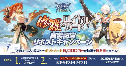 「3次職」実装を記念して、Xにてキャンペーンを実施します。『ラグオリ』公式Xアカウント(@ragori_jp)をフォローし、「#ラグオリ」 「#3次職RPCP」 の2つのハッシュタグが入ったポストをリポストしてください。抽選でギフトカード(5,000円分)を5名様にプレゼントします。