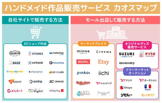 本カオスマップでは「自社サイト」で販売する方法と、「ECモール」への出店に分けて、ハンドメイド作品販売サービスを紹介しております。