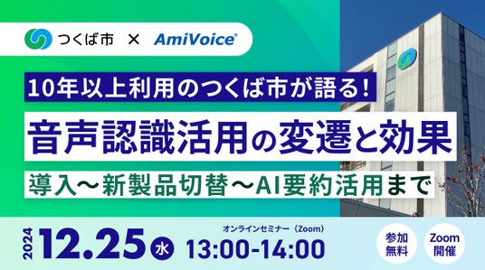 2024年12月25日(水)、株式会社アドバンスト・メディア(本社:東京都豊島区、代表取締役会長兼社長:鈴木清幸 以下、アドバンスト・メディア)は、オンラインセミナー「10年以上利用のつくば市が語る!音声認識活用の変遷と効果<導入~新製品切替~AI要約活用まで>」を開催いたします。