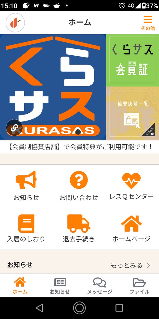 1:会員制賃貸「くらサス」の会員証として活用「いい生活Home」のTOP画面のバナーに「くらサス」のロゴマークが表示されます。アプリを起動してロゴマークを見せると特典を受け取れます。