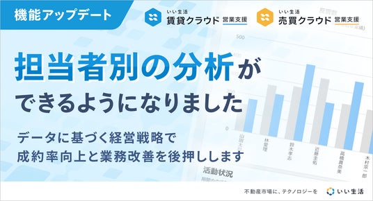 不動産業務を網羅するバーティカルSaaSと業務効率を推進するBPaaS(※1)で不動産市場のDXを推進する株式会社いい生活(東京都港区、代表取締役社長 CEO:前野 善一、東証スタンダード:3796、以下:いい生活)は、「いい生活賃貸クラウド営業支援」および「いい生活売買クラウド営業支援」において、2025年1月22日に「担当者別分析レポート」を追加したことをお知らせいたします。この度の機能追加により、不動産事業者の担当者別で反響数や来店数(率)、成約数(率)などが分析可能になり、媒体別分析と合わせてデータ活用の幅が広がり、成約率向上に向けた業務改善サイクル強化に貢献します。