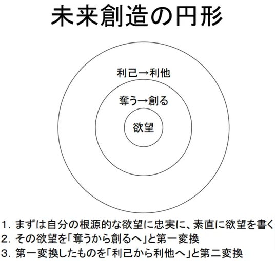 未来創造の円形: 既存の常識や先入観に囚われず、ワクワクするような未来の可能性を描き、その到達イメージから逆算するアプローチ。