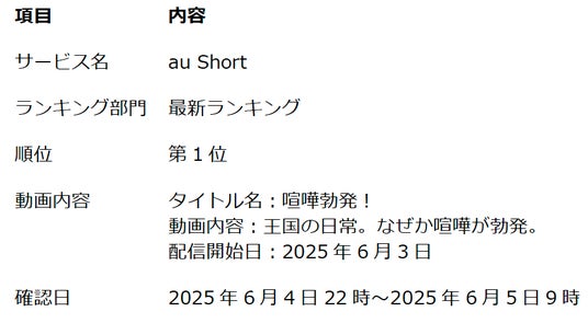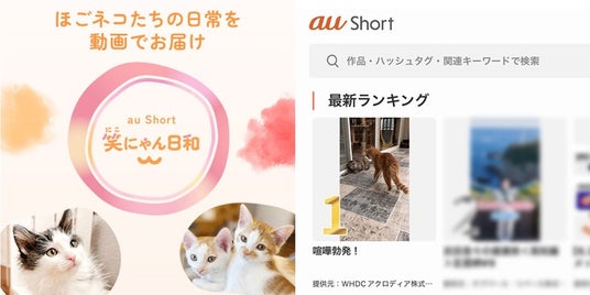 THE WHY HOW DO COMPANY株式会社(本社:東京都新宿区、代表取締役社長:岩尾俊兵、東証スタンダード:3823、以下「ワイハウ社」)は、100%子会社のWHDCアクロディア株式会社(本社:東京都新宿区、代表取締役社長:窪田圭一)が展開する保護猫応援プロジェクト「笑にゃん日和」において、KDDI株式会社(本社:東京都千代田区、代表取締役社長CEO:松田浩路、以下「KDDI」)が展開する動画配信アプリ『au Short』で配信中の保護猫動画が、『au Short』アプリ内の再生回数における最新ランキングにおいて2025年6月4日付で第1位を獲得いたしましたことをお知らせいたします。