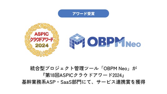統合型プロジェクト管理ツール「OBPM Neo」が『第18回ASPICクラウドアワード2024』基幹業務系ASP・SaaS部門にて、サービス連携賞を獲得