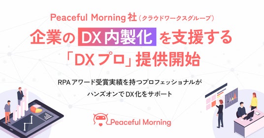 企業と個人をつなぐオンライン人材マッチング事業を展開する株式会社クラウドワークス(本社:東京都渋谷区 代表取締役社長 兼 CEO:吉田 浩一郎 以下「当社」)のグループ会社で、RPA*・ローコードツールを活用しDX推進を支援するPeaceful Morning株式会社(本社:東京都渋谷区、代表取締役:田中 雄太 以下「Peaceful Morning社」)は、即戦力のDX人材を企業にご紹介し社内開発体制づくりを行うなど、DX内製化を支援する「DXプロ」を提供開始いたしました。
