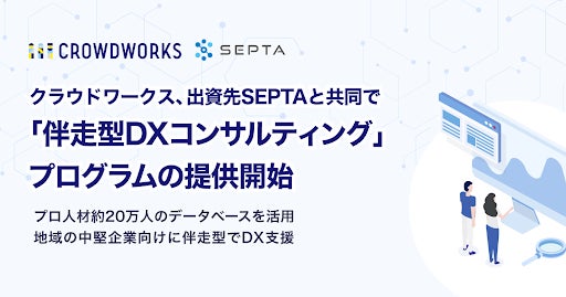 フリーランス業界最大級プラットフォーム(登録ワーカー680万人・登録企業100万社)を基盤に、IT人材&DXコンサルティングサービスを提供する株式会社クラウドワークス(本社:東京都渋谷区 代表取締役社長 兼 CEO:吉田 浩一郎 以下「当社」)は、プロシェアリング事業・コンサルティング事業をする株式会社SEPTA(本社:東京都渋谷区 代表取締役:山口貴士 以下「SEPTA」)と共同で、「伴走型DXコンサルティング」プログラム(以下、本プログラム)の提供を開始いたしました。