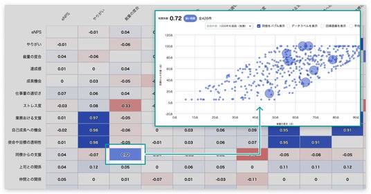 各設問間の相関関係を視覚的に表示し、1クリックで詳細確認が可能。勤怠情報との掛け合わせも含め、重要な関係性を迅速に発見し、仮説検証のスピードを向上させます。