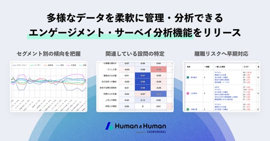 フリーランス業界最大級プラットフォーム(登録ワーカー680万人・登録企業100万社)を基盤に、IT人材&DXコンサルティングサービスを提供する株式会社クラウドワークス(本社:東京都渋谷区 代表取締役社長 兼 CEO:吉田 浩一郎 以下「当社」)は、当社が提供する人的資本経営SaaS「Human & Human」において、企業の多様な人事関連のサーベイデータを取り込み、柔軟に管理・分析できるエンゲージメント・サーベイ分析機能(以下、新機能)をリリースいたしました。