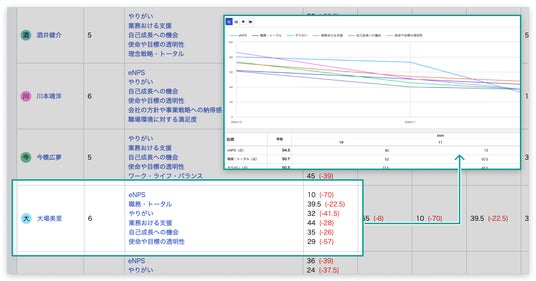 スコアの高低だけでなく前回からの変化に着目した条件設定により、離職リスクのある従業員を簡単に抽出できます。状況を多面的に確認し、即時のフォローアクションに繋げます。