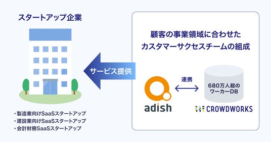 SaaSの専門領域が細分化する中で、例えば医療、金融、不動産などの知識・知見・トレンド・ルールが必要となる案件が増加しており、これらの領域への迅速な対応の遅れが課題となるケースがありました。この課題背景のもとに、当社はアディッシュとの業務提携を締結し、当社のワーカーデータベースとアディッシュ社のカスタマーサクセスの専門知識・ノウハウを組み合わせてカスタマーサクセスチームを組成し、顧客課題に合わせたソリューションを提供します。