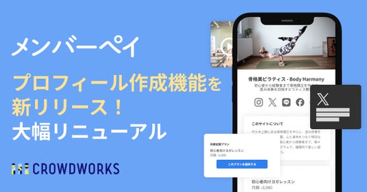 フリーランス業界最大級プラットフォーム(登録ワーカー700万人・登録企業100万社)を基盤に、IT人材&DXコンサルティングサービスを提供する株式会社クラウドワークス(本社:東京都渋谷区 代表取締役社長 兼 CEO:吉田 浩一郎 以下「当社」)は、当社が運営するオンライン月額定額決済サービス「メンバーペイ」において、「プロフィール作成機能」(以下「新機能」)をリリースいたしました。従来の決済機能に加えて、一つのページを作成するだけでSNSやブログなどの複数のリンクやコンテンツへの誘導が可能となり、個人の活動に関する魅力・情報発信を多角的に支援するサービスとして初期費用なし*でご利用いただけます。