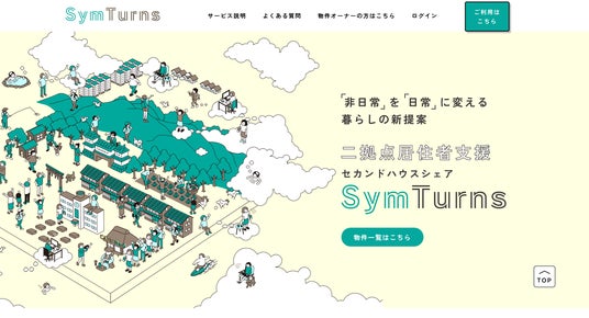 2024年に新しく登場した「SymTurns」は、二地域居住を実現したい人と空き家を活用したいオーナーをマッチングし、共同で管理・利用できる環境を提供することで、セカンドハウスを手軽にタイムシェアリングできるサービス。民泊でもなく、シェアハウスでもなく、通常のホテル滞在でもなく、また完全に自邸をかまえて二拠点で暮らすわけでもない、新しいスタイルを提案しています。