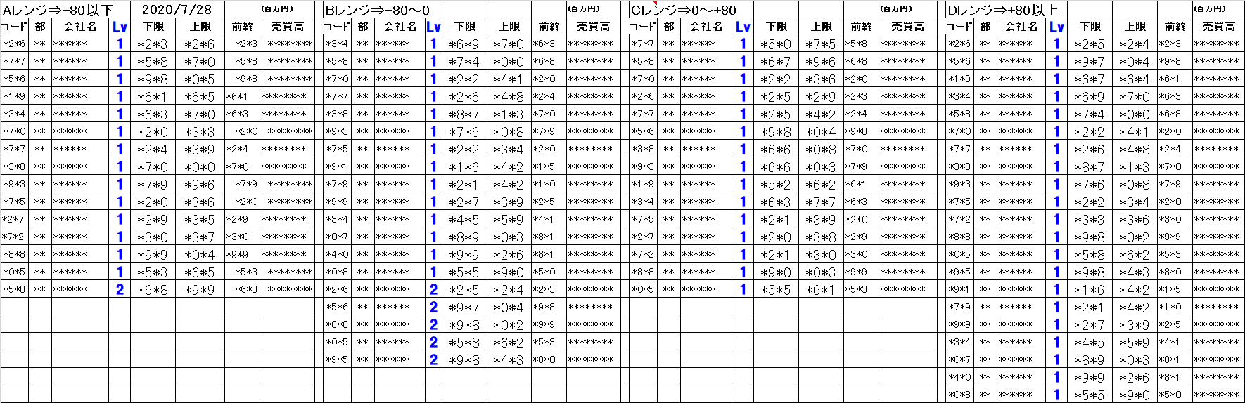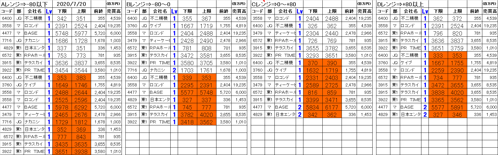 2020/7/22(水曜日) 今日のシステムトレードの仕掛候補一覧です。今日の日経の寄り付きはAレンジでした仕掛表の各レンジは日経平均の前日終値比で以下のよ... ...続きを読む