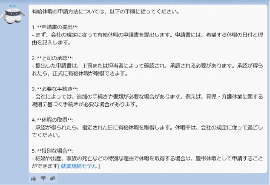 例としては就業規則のファイルを学習させた場合、mitoco AIが有給休暇の申請方法について正確に回答できるようになります。