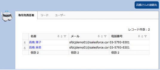 例としては、mitoco AIに「高橋さんの連絡先」を質問した場合、取引先責任者・リード・ユーザーをまとめて検索することができます。