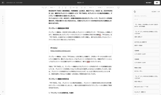 これまで搭載していた校正機能と比べ、UI(ユーザーインターフェイス)を大幅に使いやすくした上、曜日の間違いや語尾の統一などのプレスリリースの文章を整えることに特化した校正機能となっています。