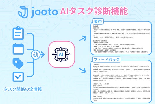 株式会社PR TIMES(東京都港区、代表取締役:山口拓己、東証プライム:3922)が運営するタスク・プロジェクト管理ツール「Jooto(ジョートー)」は、登録タスクに蓄積された情報からAIが要約・フィードバックを生成する「AIタスク診断機能」を、2025年4月22日(火)にリリースいたしました。本機能により、案件の概要や成果を客観的に可視化・評価し、チームでの振り返りや改善がこれまで以上にスムーズになります。31日間無料でお試しいただけますので、まずは実際にご体験いただければ幸いです。