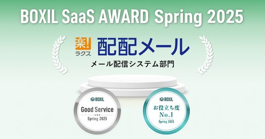 株式会社ラクス(本社:東京都渋谷区、代表取締役:中村 崇則)が提供するメールマーケティングサービス「配配メール」は、スマートキャンプ株式会社(以下「スマートキャンプ」)が主催する「BOXIL SaaS AWARD Spring 2025」のメール配信システム部門で「Good Service」「お役立ち度No.1」に選出されました。