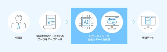 申請者が領収書やICカードなどのデータをアップロードするとAIエージェントが申請データを自動で作成