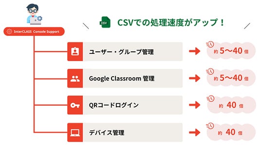 一方で、Chromebook の運用管理は、従来のコンピュータの管理とは異なり、ユーザーアカウントをベースに管理します。そのため、Google Workspace for Education のアカウント管理が特に重要であり、毎年の年次更新におけるユーザーアカウントの組織移動や貸し出し端末の管理の煩雑さが新たな課題となっています。こうした状況を踏まえ、教職員の業務負荷をさらに軽減するべく、『InterCLASS(R) Console Support』でのバッチ処理の高速化に対応いたしました。