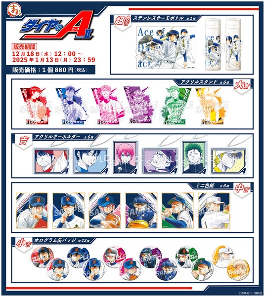 株式会社エディア(本社:東京都千代田区、代表取締役社長:賀島 義成)の子会社、株式会社ティームエンタテインメント(本社:東京都千代田区、代表取締役社長:賀島 義成 以下:ティームエンタテインメント)は、2024年12月18日(水) 12:00より『ダイヤのA act II』のオリジナルグッズを、インターネットで購入できる抽選くじサービス『まるくじ』にて販売開始したことをお知らせいたします。