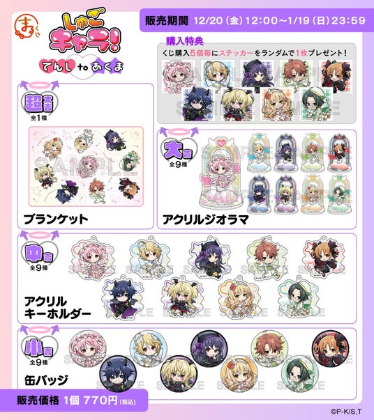 各賞の商品といたしましては、ブランケット、アクリルジオラマ、アクリルキーホルダー、缶バッジなど、ファンの皆様に喜んでいただけるラインアップとなっております。