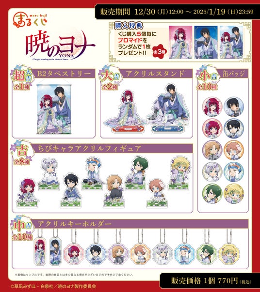 株式会社エディア(本社:東京都千代田区、代表取締役社長:賀島 義成)の子会社、株式会社ティームエンタテインメント(本社:東京都千代田区、代表取締役社長:賀島 義成 以下:ティームエンタテインメント)は、2024年12月30日(月) 12:00よりTVアニメ『暁のヨナ』の新規オリジナルグッズを、インターネットで購入できる抽選くじサービス『まるくじ』にて発売することをお知らせいたします。