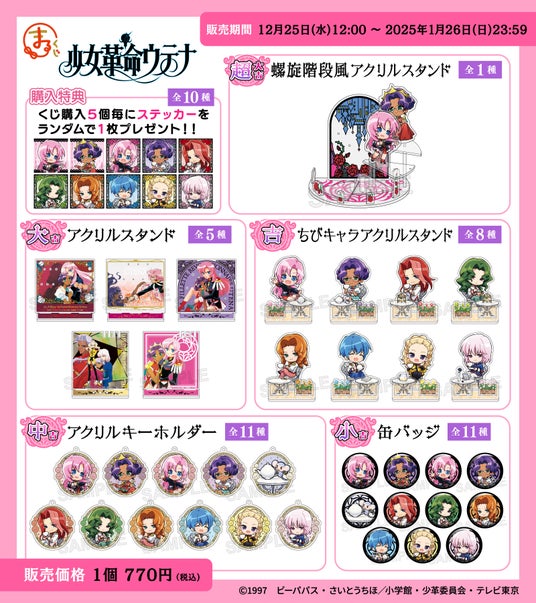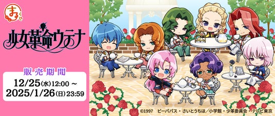 株式会社エディア(本社:東京都千代田区、代表取締役社長:賀島 義成)の子会社、株式会社ティームエンタテインメント(本社:東京都千代田区、代表取締役社長:賀島 義成 以下:ティームエンタテインメント)は、2024年12月25日(水) 12:00よりTVアニメ『少女革命ウテナ』の新規オリジナルグッズを、インターネットで購入できる抽選くじサービス『まるくじ』にて販売開始したことをお知らせいたします。