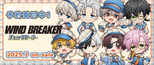 今回はTVアニメ『WIND BREAKER』から「チェックセーラー」をテーマに、「桜 遥」、「楡井 秋彦」、「蘇枋 隼飛」、「桐生 三輝」、「梶 蓮」、「梅宮 一」、「兎耳山 丁子」、「十亀 条」の新規描き起こしイラストを使用したオリジナルグッズが発売決定!