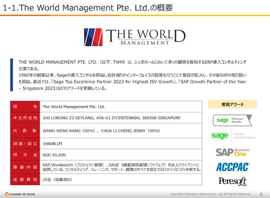 このたび株式を取得するTWM社は、シンガポールのITコンサルティング企業です。TWM社は、シンガポール国内の多くの企業に対し、主に、販売管理や在庫管理、会計管理などのバックエンドシステムの導入コンサルティングとメンテナンスサービスを提供しております。