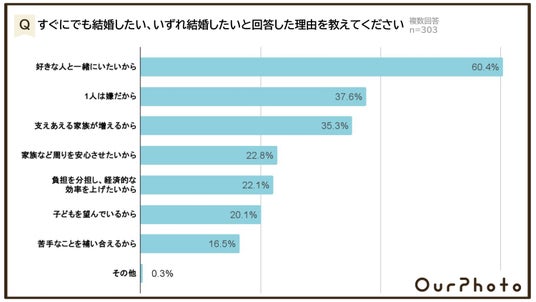 「すぐにでも結婚したい」「いずれ結婚したい」と回答した方にその理由を質問したところ、1位「好きな人と一緒にいたいから」(60.4%)、2位「1人は嫌だから」(37.6%)、3位「支えあえる家族が増えるから」(35.3%)という結果になりました。