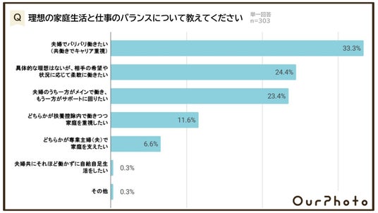 - 理想の家庭生活と仕事のバランスについては、「夫婦でバリバリ働きたい(共働きでキャリア重視)」が33.3%で最も多く、3人に1人が共働き思考であることが判明。一方で「どちらかが扶養控除内で働きつつ家庭を重視したい」と回答した人は約1割(11.6%)にとどまった。<結果5>
