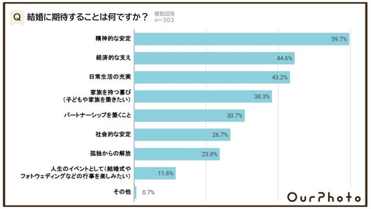 「すぐにでも結婚したい」「いずれ結婚したい」と回答した方に、結婚に期待することを質問したところ、1位は「精神的な安定」(59.7%)2位は「経済的な支え」(44.6%)、3位は「日常生活の充実」(43.2%)でした。