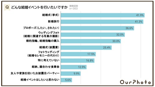 「すぐにでも結婚したい」「いずれ結婚したい」と回答した方に、どんな結婚イベントをしたいか聞いたところ、「結婚式(挙式)」が41.9%で最も多く、次いで「新婚旅行」(41.3%)、「プロポーズ(したい、されたい)」(36.6%)が続く結果になりました。
