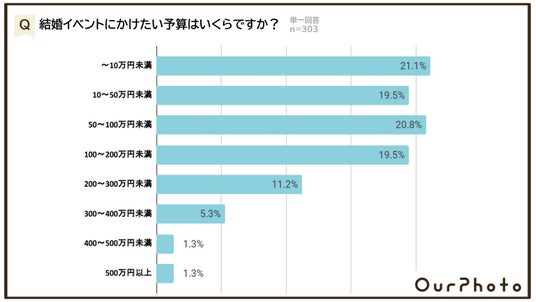 「すぐにでも結婚したい」「いずれ結婚したい」と回答した方に、結婚イベントにかけたい予算を聞いたところ、「~10万円未満」と回答した人は2割(21.1%)を超える結果となりました。