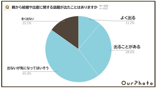 親から結婚や出産に関する話題が出るか聞いたところ「よく出る」、「出ることがある」、そして「出ないが気になってはいそう」と回答した人の合計は8割(84.8%)を超える結果になりました。