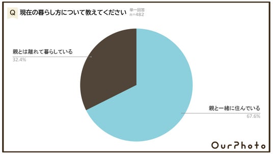 現在の暮らし方について質問したところ、「親と一緒に住んでいる」人は67.6%、「親とは離れて暮らしている」人は32.4%でした。