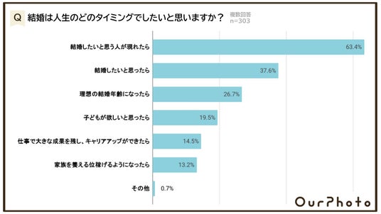 「すぐにでも結婚したい」「いずれ結婚したい」と回答した方に、結婚は人生のどのタイミングでしたいか質問したところ、「結婚したいと思う人が現れたら」が63.4%と最も多く、次いで「結婚したいと思ったら」が37.6%という結果になりました。