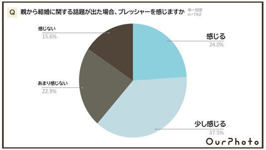 親から結婚や出産に関する話題が「よく出る」「出ることがある」と回答した方に、親から結婚に関する話題が出た場合、プレッシャーを感じるか聞いたところ、「少し感じる」と回答した人が最も多く37.5%を占めました。次いで、「感じる」と回答した人は24.0%となり、両回答を合わせると、プレッシャーを感じる人の割合は6割(61.5%)に達しました。