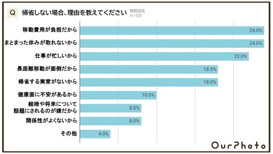 今年の年末年始に帰省する予定はないと回答した方に、帰省しない理由を聞いたところ、「移動費用が負担だから」「まとまった休みが取れないから」が同率1位でそれぞれ24.0%という結果になりました。