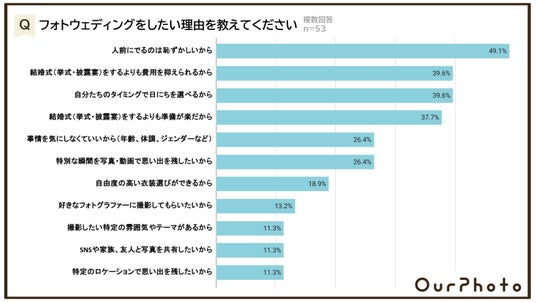 - フォトウェディングをしたい人に理由を聞いたところ、最も多かったのは「人前に出るのは恥ずかしいから」で、約半数(49.1%)を占める結果に。<結果11>