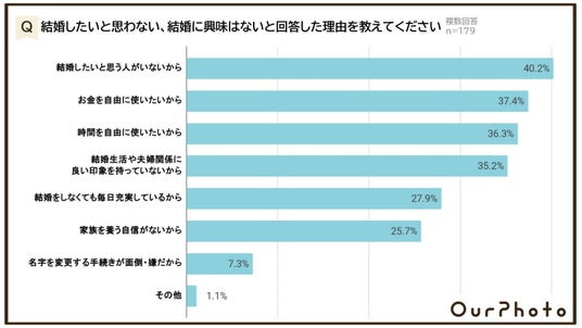 結婚について現在の考えで「結婚したいと思わない」「結婚に興味はない」と回答した方にその理由を聞いたところ、4割(40.2%)を超える人が「結婚したいと思う人がいないから」と回答しました。次いで「お金を自由に使いたいから」(37.4%)、「時間を自由に使いたいから」(36.3%)、「結婚生活や夫婦関係に良い印象を持っていないから」(35.2%)が続く結果となりました。